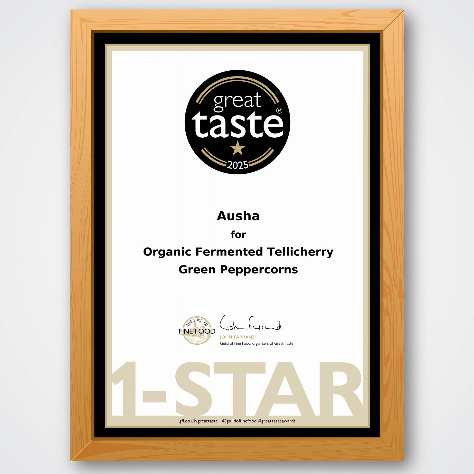 - Ausha Green Peppercorns in Brine has won the 1* GREAT TASTE AWARD 2025.