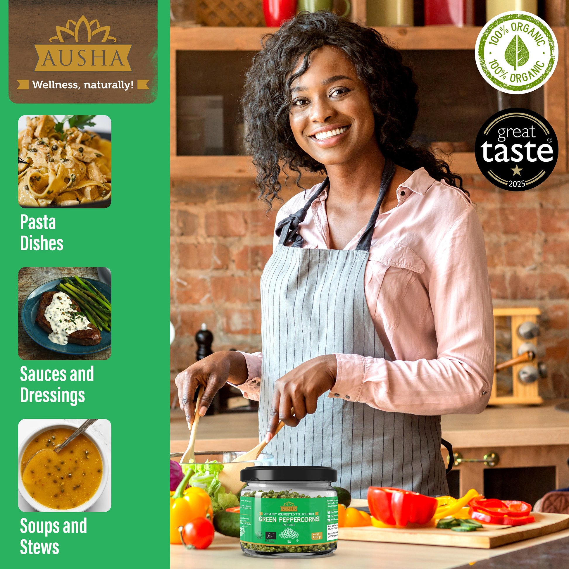 Ausha’s Organic Green Peppercorns are carefully picked while still young and preserved in a natural brine to maintain their vibrant colour and delicate heat. Milder than black pepper, they’re perfect for sauces, marinades, or gourmet cheese boards. A unique addition to any spice collection — bold, bright, and organically sourced.FREE DELIVERY ON ALL ORDERS.NO MINIMUM ORDER VALUE CONDITION.