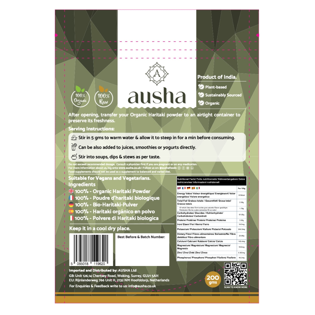 Ausha’s Organic Haritaki Powder is made from the dried fruit of the Terminalia chebula tree, traditionally valued in Ayurvedic practices. With its mildly bitter taste and fine texture, it can be mixed into warm water or herbal blends. Grown organically and minimally processed, it’s a simple addition to your natural wellness cupboard..FREE DELIVERY ON ALL ORDERS.NO MINIMUM ORDER VALUE CONDITION. Warning - Please don't not exceed the recommended dose. Food supplements should not be used as a substitute for a varied diet. The product should be stored out of the reach of young children.